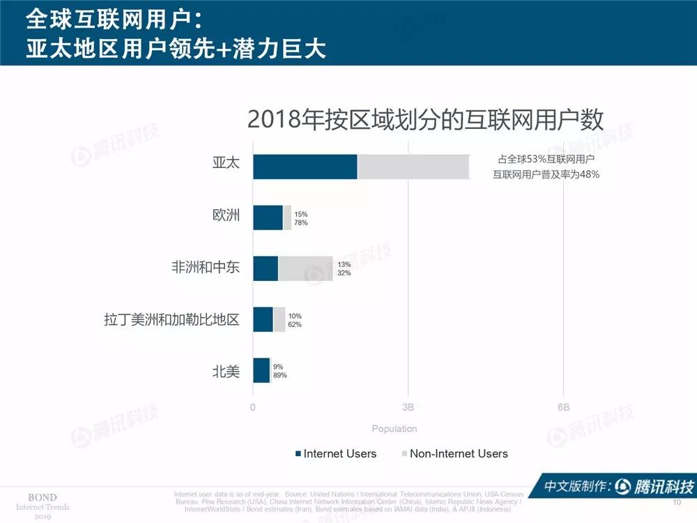 报告公布了几大区域的互联网人口渗透率:亚太地区为48%,欧洲地区为78%,非洲和中东地区为32%,拉美和加勒比海地区为62%,北美地区为89%。这意味着,非洲和中东地区的互联网覆盖,还有很大的提升空间。