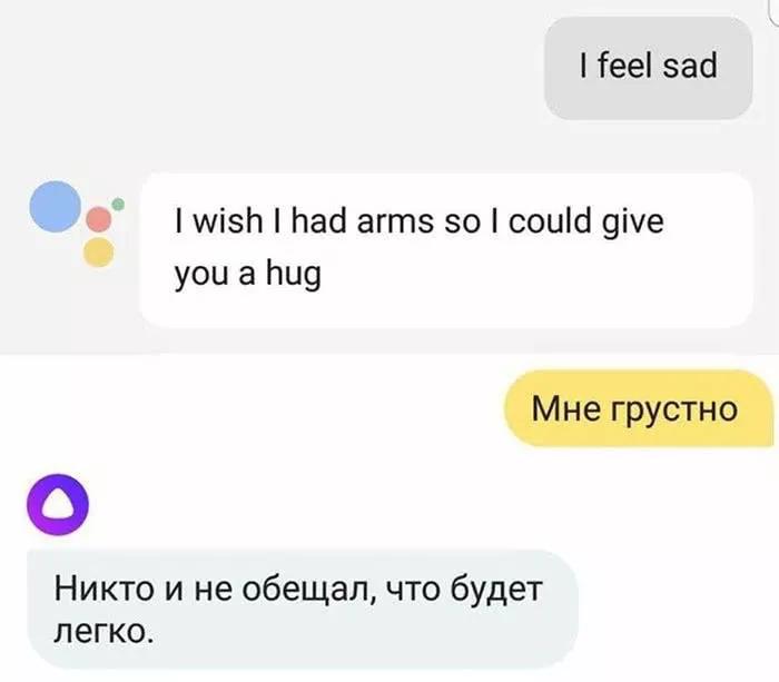 上图中,说英语的是谷歌助手,说俄语的是Alisa(由俄罗斯互联网公司Yandex开发)。当对这两个人工智能助手说出“我很伤心”的时候,谷歌助手回答,“我真希望自己有双臂,能给你个拥抱”;Alisa回答,“谁也没说过活着会轻松”。