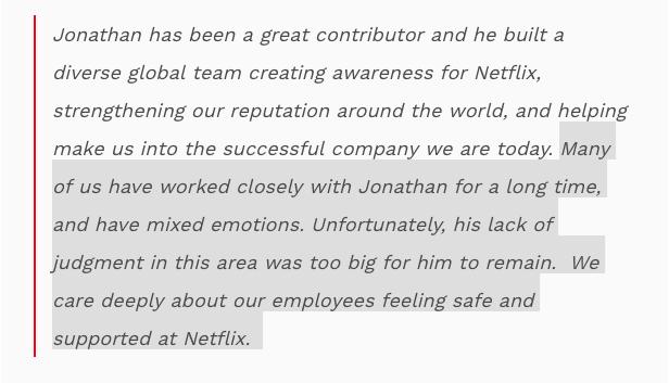 不幸的是,乔纳森在言语方面的误判所犯下的错,实在是太典型了,以至于我们无法找到任何让他继续留下的理由。我们深切地关心并致力于让奈飞员工在公司内部得到安全感和相关支持。