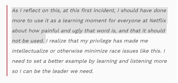在这封邮件中,哈斯廷斯还说,“现在回顾来看,早在他首次公开使用冒犯性言语的时候,我就应该毫不保留地采取相应措施,并以此作为典型学习案例,让奈飞所有员工都感受和明白,这种冒犯性语言丑恶的一面,同时又让人极其痛苦的一面,并且在以后绝不能使用类似言语。”
