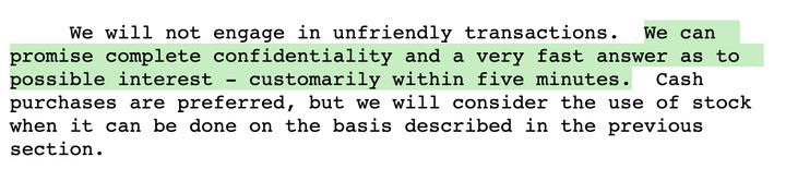 沃伦·巴菲特(Warren E. Buffett)1982年度致股东信中的承诺:我们可以保证对所有交易的绝对保密性,同时在涉及潜在利益的时候,可以做到快速答复,通常答复时间只需要五分钟。