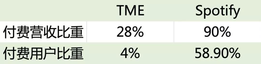 TME的情况便不太一样,总营收为57.4亿元,在线音乐服务收入(订阅和数字专辑等营收)为16.1亿元。社交娱乐服务(直播打赏、会员等业务营收)41.3亿元。也就是说,付费营收在总营收中的占比仅为28%。