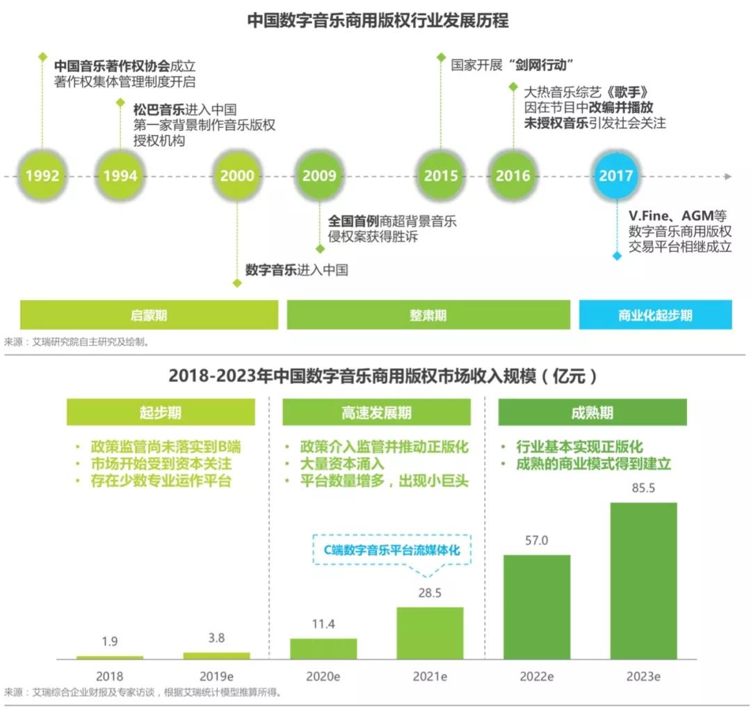 中国音乐商用版权概念的源起可追溯至上个世纪末,但2017年v.Fine Music等数字音乐商用版权交易平台成立之后,行业正式进入商业化发展时期。