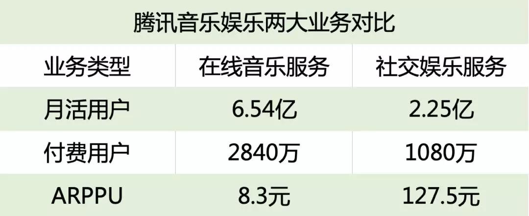 在线音乐服务,2019年第一季度的月活用户6.54亿,其中付费用户达2840万,比2018年同期增长27.4%;每付费用户平均收入(ARPPU)为8.3元人民币;