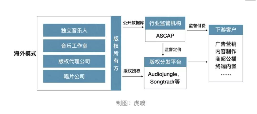 这种模式在这在国外已经是非常成熟。比如说版权所有方会把版权授权给版权分发平台,由版权分发平台负责把音乐授权给下游B端客户使用,版权所有方和版权分发平台都可以从中收取一笔费用。