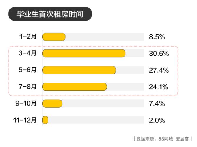 近30%毕业生选择中介门店渠道找房。值得注意的是,房东直租也成为了毕业生找房的重要途径,选择这种方式租房的毕业生占比15.3%,其中,95后对于相对便宜的房东直租房源接受度更高。从找房时间上看,超过80%的毕业生首次租房时间集中于3-8月,研究生及以上学历的毕业生租房时间则更多选择在3-4月。