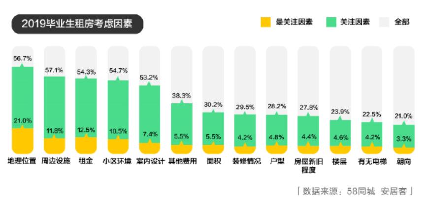《2019高校毕业生就业居行报告》还对毕业生租房时关注的因素进行了统计,租房时毕业生关注的因素TOP5为地理位置、周边设施、租金、小区环境、室内设施,占比均超过50%。其中,地理位置是毕业生时找房关注的首要因素,一线城市毕业生对于地理位置的关注度高于新一线城市。