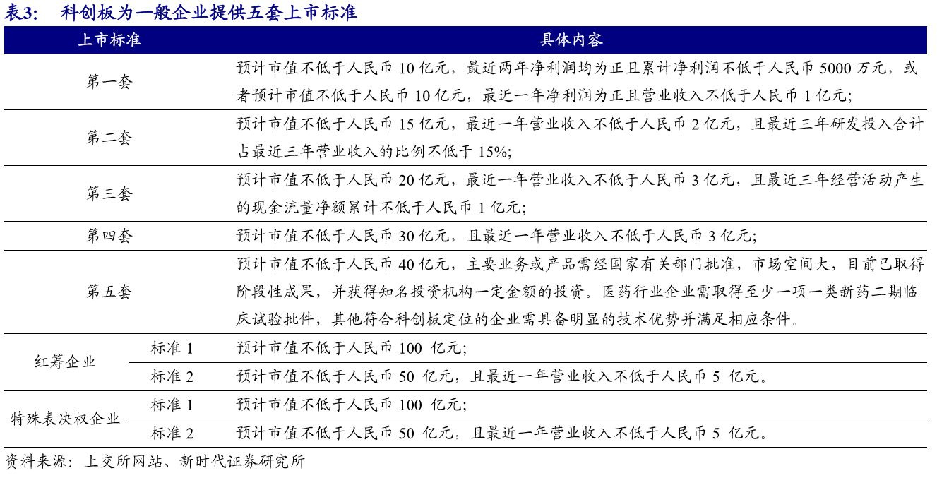 科创板的五套上市标准在盈利、营收和市值上为大部分企业建立了门槛,数据来源:新时代证券研究所