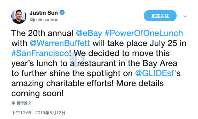 当地时间6月12日,孙宇晨发推称,与巴菲特的慈善午餐将于7月25日在旧金山举行。