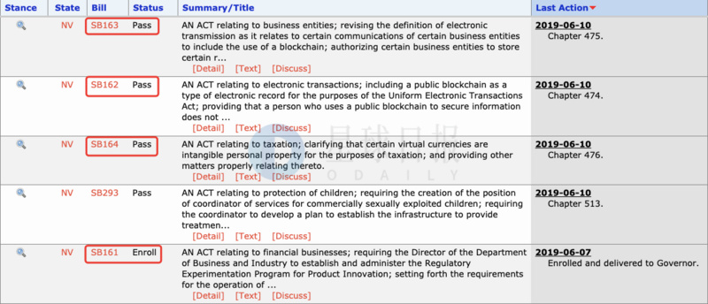 内华达州州长Steve Sisolak已于6月7日签署了由共和党参议员Ben Kieckhefer发起的参议院第162、163和164号法案(SB162、SB163、SB164)。第四份关于区块链的法案SB 161(同样为Ben Kieckhefer发起)已提交给州长签字,但截至发文尚未签署。(Northern Nevada Business View)