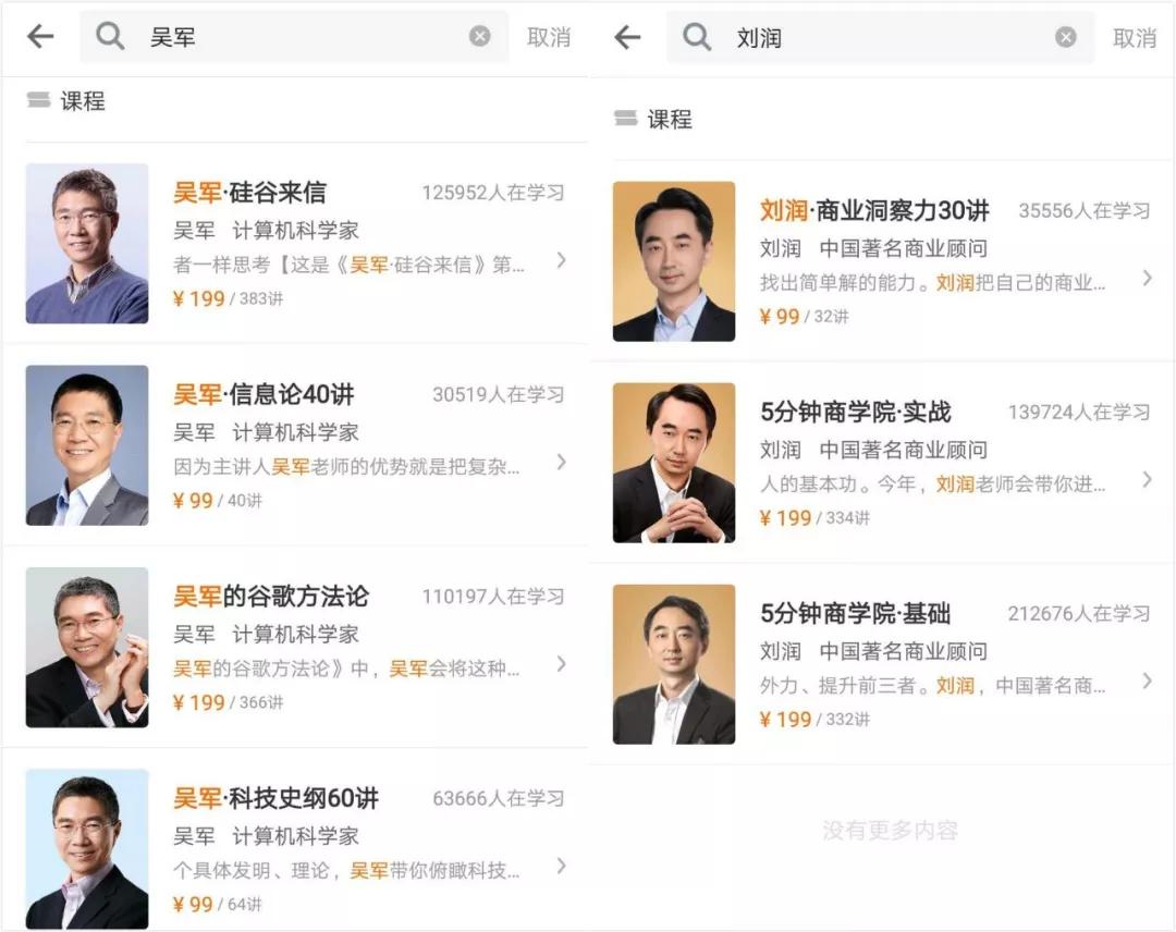 从刘润和吴军两位老师的专栏也可以看出大V的透支和损耗。早期的专栏均为199元的课程,每个专栏有三百多讲,知识密度和强度很大。而近期推出的《商业洞察力30讲》或是《信息论40讲》均为99元课,课程时长也大打折扣,从300讲变为30讲。