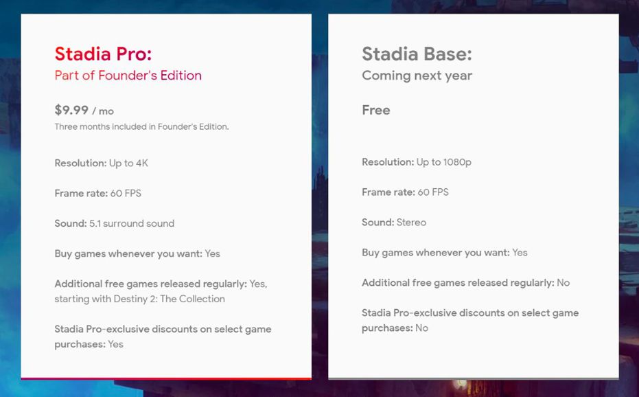 谷歌推出两种订阅服务:一种是Stadia Pro付费订阅,每月订阅价格为9.99美元,拥有部分免费游戏,而其他游戏需要单独购买;明年将会推出Stadia Base免费订阅。谷歌还推出了129美元“创始人版”(Stadia Founder Edition),包括游戏手柄、3个月Stadia Pro订阅等内容。