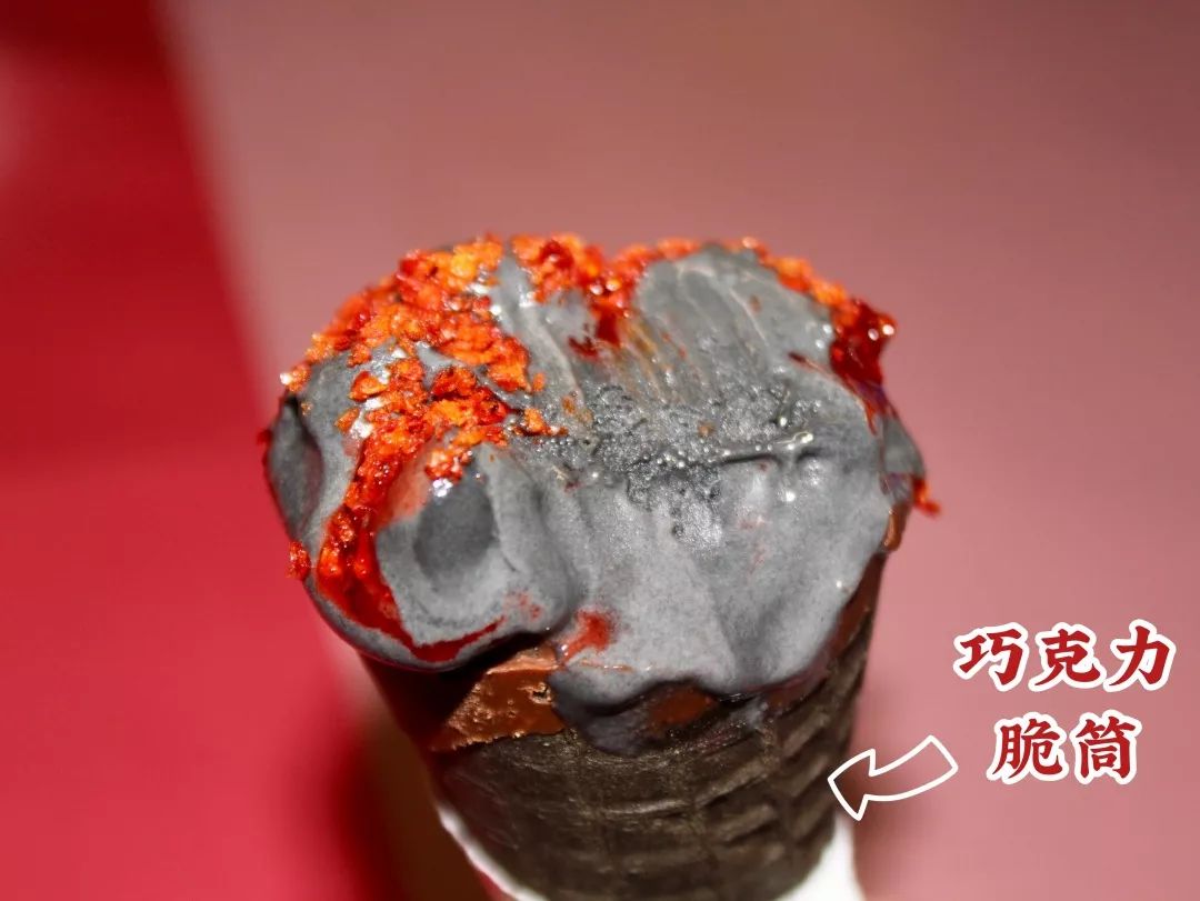一向清新甜美味的可爱多今年突然向黑暗料理界进发了。货真价实的干辣椒叠加桑葚味酸甜酱再加炭黑冰淇淋,争议度满分。