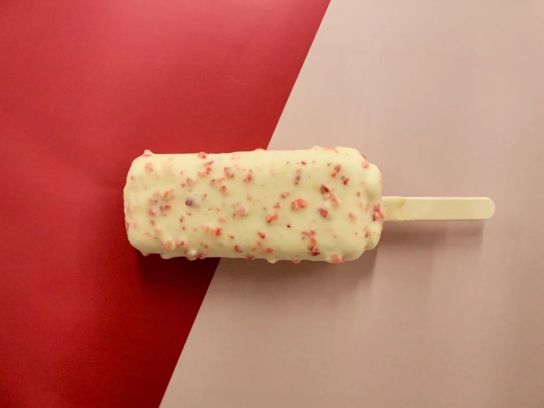 白巧克力脆皮上洒满了干草莓碎,脆脆的酸酸的,很好地中和了巧克力的甜,雪糕里还藏着大块的草莓果肉,整个冰淇淋就是草莓开会。吃完跟别人讲话都能喷出草莓味。草莓控们千万不要错过。