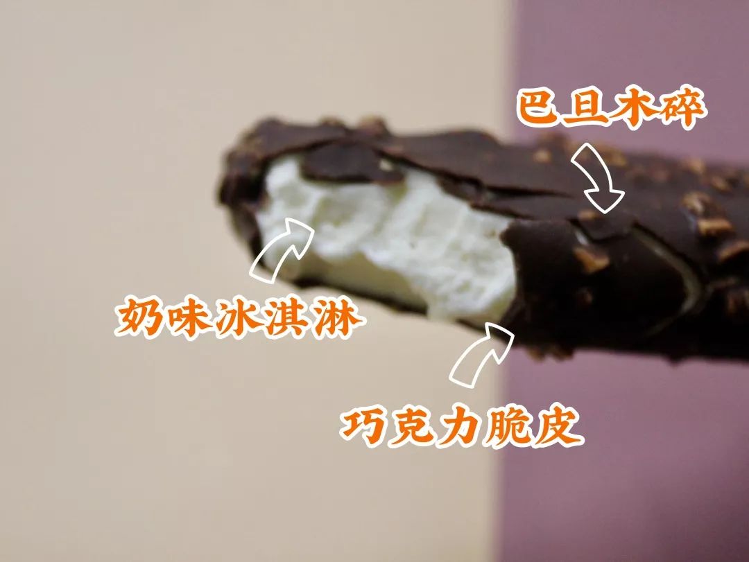 脆皮上的巴旦木还保持着香脆的口感,奶味冰淇淋也贯彻了明治乳业一贯的高水准,唯一的败笔在于巧克力脆皮太甜,毁掉了整个雪糕的平衡。