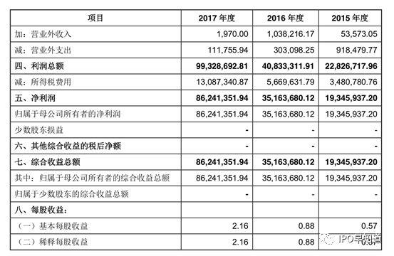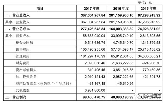 财务数据显示,2015年、2016年和2017年,公司报告期内的营业收入分别为0.97亿元元、2.01亿元、3.67亿元,营业利润分别为2369.16万元、4009.82万元、9943.85万元、归母净利润分别为1934.59万元、3516.37万元、8624.14万元。