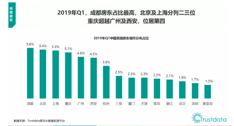 据民宿招商与投资、中商产业研究院的数据表明,2017年重庆民宿数量仅有443家,位列全国第20;而据《2019年中国在线民宿预订行业发展研究报告》显示,今年一季度,重庆民宿运营者的城市占比已经弯道超车广州和西安,跃居第四。身为“网红城市”的重庆依靠其在旅游板块的影响力,正迅速拉动包括民宿行业在内的吃、住、玩、游、购、娱相关的市场增长。