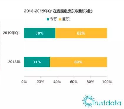 据Trustdata大数据显示,2018年在线民宿房东中有近七成是兼职运营,这一数据虽然在2019年一季度减少为六成,但兼职运营者仍旧占据较大比重。