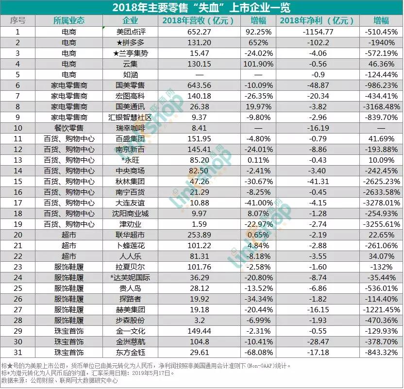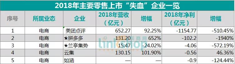 这些企业涵盖电商、家电零售商、百货、购物中心、超市、服饰鞋履、珠宝首饰、餐饮零售等领域。其中,电商、百货、购物中心、服饰鞋履领域是“重灾区”。以电商为例,美团点评去年亏损达1154.77亿元,净利润增长为负510.45%。拼多多去年亏损102.2亿元,2017年这一数字为5亿,亏损增幅高达1940%。