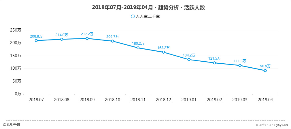 根据易观千帆的数据显示,从去年9月开始,人人车月活数量就在不断下滑,目前人人车的月活不足百万(仅为90.9万),相较之下瓜子二手车的月活人数为452.5万,二者之间的差距非常巨大。加之目前二手车电商的风口早已消散,想要急需获得资本市场的支持,人人车就必须拿出令人耳目一新的成绩。这一点,难度可想而知。