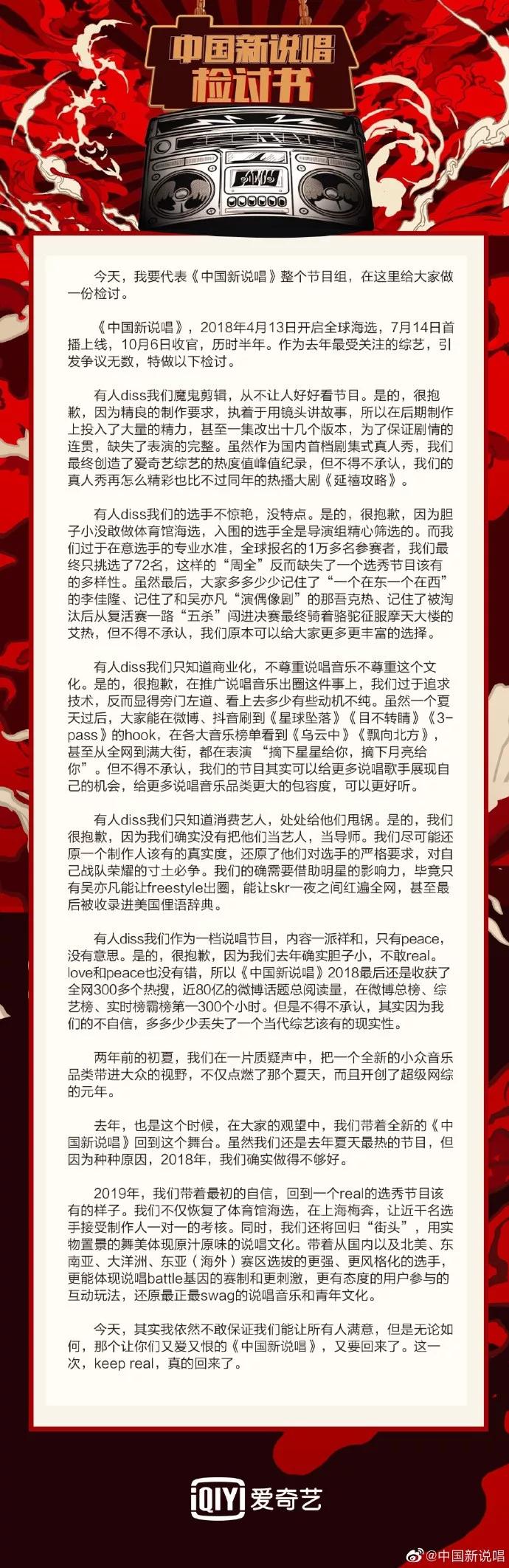 在信中,他用“半检讨半炫耀”的方式,细数了2018年《中国新说唱》第一季的几大罪状。