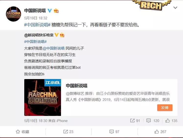 没想到,节目组不但没有谴责这种行为,还加入了剧透大军。新浪微博上,被称为新说唱民间儿子的@新说唱快乐源泉,便专门负责“剧透”,目标则是超过某剧透bot。