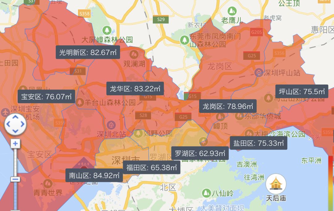 而对于深圳来说,由于常年施行9070政策,所以刚需房也基本有了定义,不超过90平米,再加上以三口之家的基本人均面积,底线则是70平米。我们从深圳现有的平均面积可以看到,大部分地区平均面积也都在90平米以下。