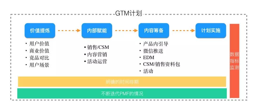 GTM本质上是一系列的营销活动,主要目的是把产品推向市场。GTM的计划可大可小,大到推出一款新产品或者把产品推向全新的市场,小到推广一个功能更新,都可以称作GTM。企业服务产品目前以SaaS形态为主,产品更新速度以周为单位,成熟的新功能GTM流程和方法,可以自家产品在激烈的同行竞争中不至于被埋没。同时,有效的价值传递,对于销售促单、流失用户召回、提升活跃度都十分有益。