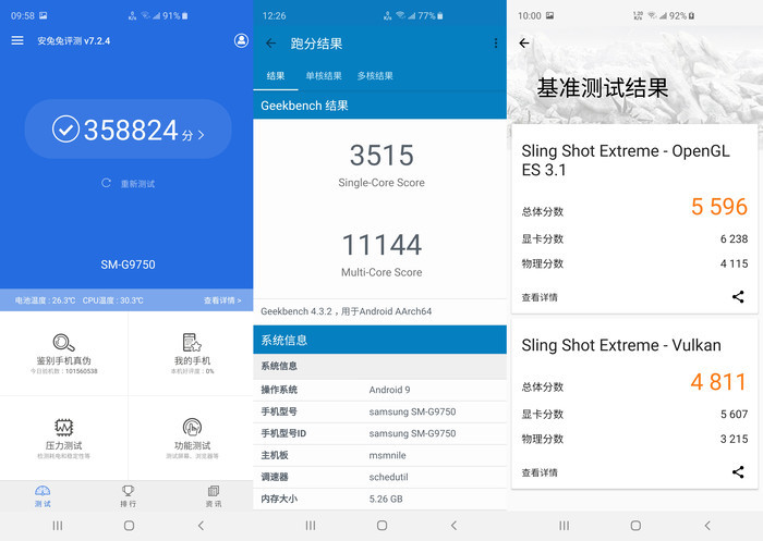跑分表现,安兔兔358824分,Geekbench单核3515分多核11144分,3DMark Sling Shot测试5596分。此次测试用的是工程机版本,实际市场版本会有更好的优化。