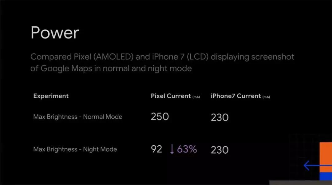 其中改善续航和手机的屏幕材质有关。以 Google 的测试数据为例,它使用了 LCD 屏幕的 iPhone 7 和 OLED 屏幕的 Pixel 手机做对比,两者在启用深色模式后使用地图导航,Pixel 手机的电量消耗下降了 63%,而 iPhone 7 则没有太大的变化。