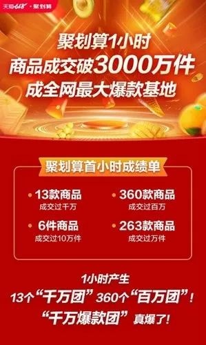 聚划算确实刷新了数据。数据显示,6月1日天猫618开场仅一小时,聚划算商品成交件数突破3000万件,不到两天内突破1亿件,创下618史上最高纪录。