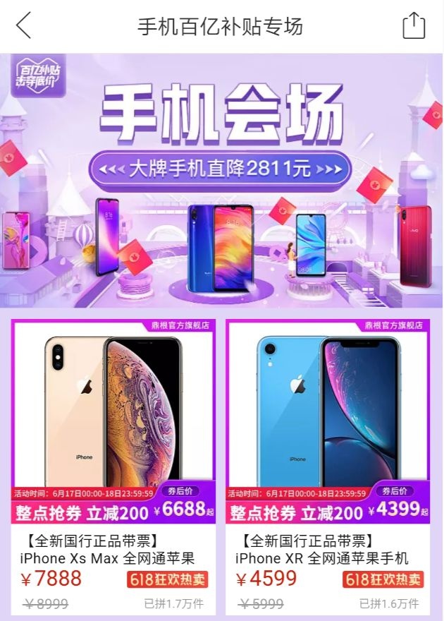 另一方面是借助促销苹果产品,提升平台品质形象。今年618期间,拼多多再度在苹果手机促销上砸钱。6月17日0点开始,这场苹果手机低价之战就已开启。从目前的价格来看,苹果官网上,IphoneXS MAX 256G配置版本手机售价为10499,而在拼多多上,该款手机仅售7688元,相比之下,直降2811元。这是京东、苏宁、天猫都难以给出的优惠。