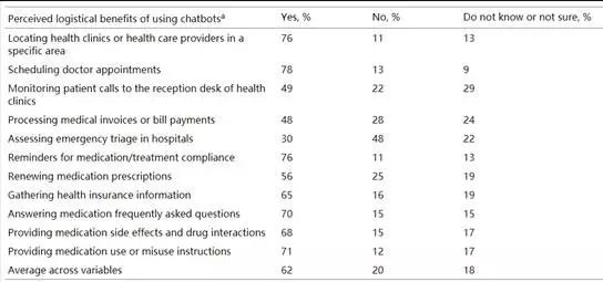调查显示,在已使用过聊天机器人的这部分医生中,表示非常满意的占13%,比较满意的占33%,不置可否的占27%,不满意的27%。也就是说总体上,正面反馈还是远大于负面的。具体而言该研究,分别对后勤流程、医护过程以及医疗效果进行了询问。个人认为这一分类颇有意义。