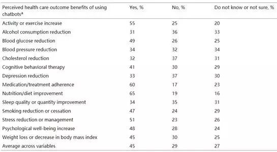 从调查结果看,使用聊天机器人对各类健康行为和指标的促进效果,医生给出的看法很大比例是积极正面的。多项指标获得了50%以上的医生认可。
