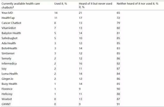 就该研究的调查情况看,目前使用过医疗聊天机器人的医生占比还偏低。共计有30%的医生称有亲自试用过某种医疗类聊天人。不过,这些聊天机器人服务面向的大部分是大众患者,少数直接面向医生群体。该研究让医生们列出了各自所知道其病人们可能进入的聊天机器人应用,最后给出共计19个。侧面体现了美国市场上用户渗透或知晓度相对较高的聊天机器人产品,如下表所示。