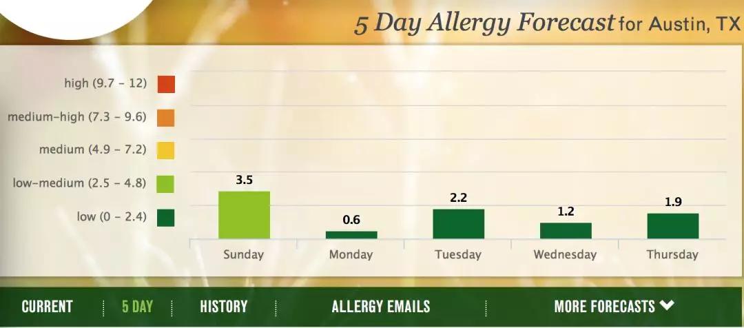 pollen.com提供全美任意地点花粉类型和浓度实况、未来5天花粉浓度预报、过去30天历史浓度