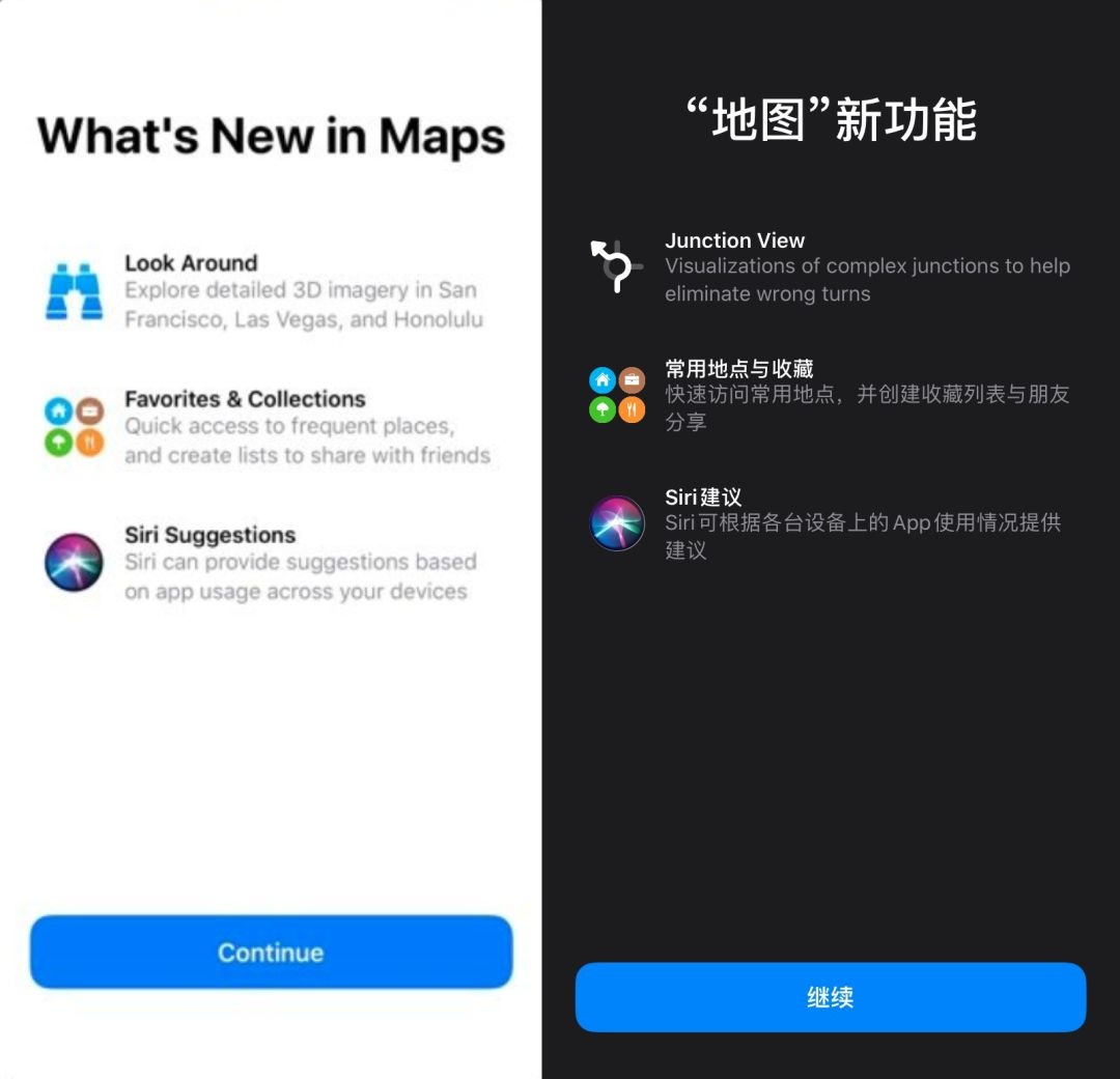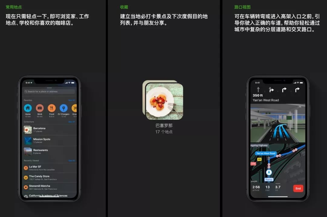 ▲苹果地图新增的路口视图、收藏等功能,图片来源:Apple