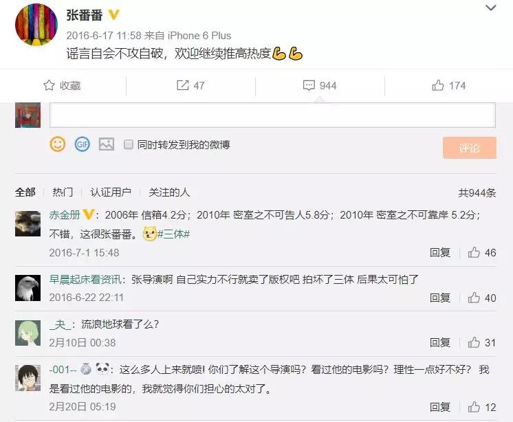 然而,在他最后一条微博的评论区中,每年都会有网友过来留言。起初是催促电影上线,随着时间的流逝,逐渐变成了谩骂,并在《流浪地球》上映之后形成了一个小高潮。