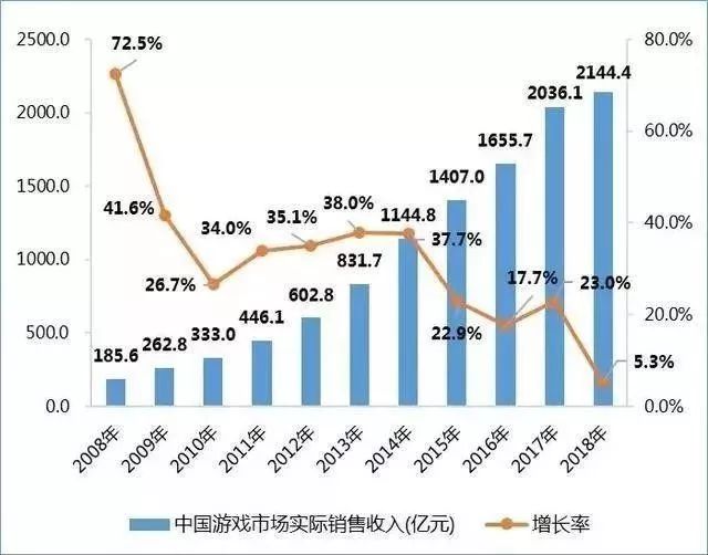 根据中国音数协游戏工委(GPC)、伽马数据(CNG)联合发布的《2018年中国游戏产业报告》,中国游戏市场实际销售收入达2144.4亿元,同比仅增长5.3%