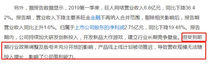 当然,大河有水小河才会满,在2019年一季度巨人的公告中,巨人也直接将收入的下降归结于游戏行业政策的变化
