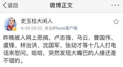 前2个月,因为涉及互联网金融,网络上弥漫着有关史玉柱的各种恶搞或攻击,史玉柱用轻松的一张微博告诉大家