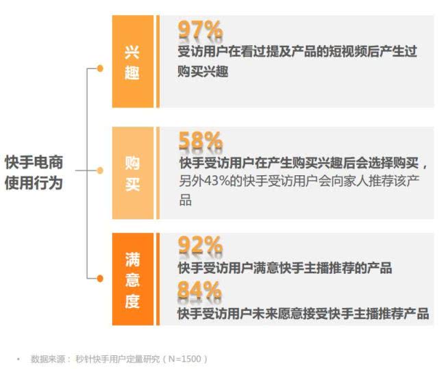 据秒针系统发布的《快手电商营销价值报告》显示,97%的受访用户在看过提及商品的短视频后产生过购买兴趣,58%的受访用户在产生购买兴趣后会购买,还有84%的受访用户未来愿意接受快手主播推荐产品。不难发现,快手对于电商平台流量转化所带来的价值是显而易见的。