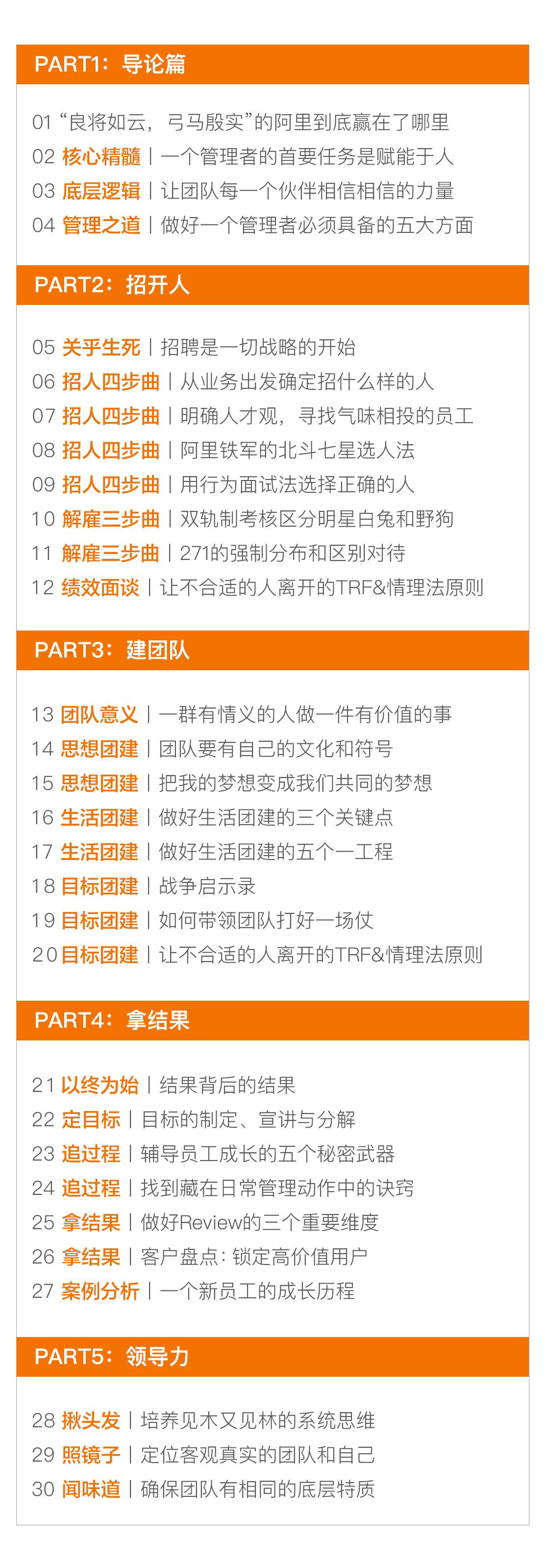 王建和老师会分5大模块、30节系列课,原汁原味的为大家详细讲解:阿里巴巴管理三板斧的核心精髓与底层逻辑,教大家如何做好招开人、建团队、拿结果,以及领导力的修炼。