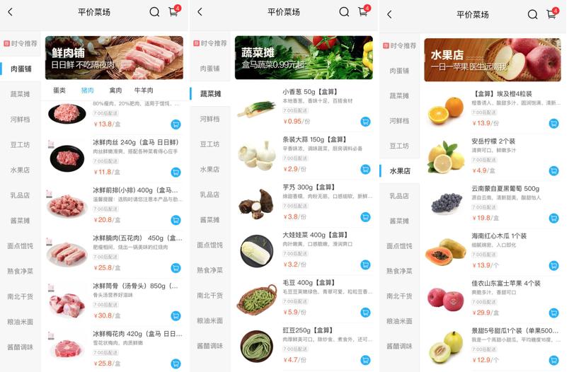 “平价菜场”有近千种商品,以生鲜为主,线上线下同步销售。平价菜场的商品备货在后仓。盒马鲜生在门店内仓中,分割出一块300平米空间,作为平价菜专柜,用来专门提供平价蔬菜,供给社区大爷大妈等价格敏感人群。