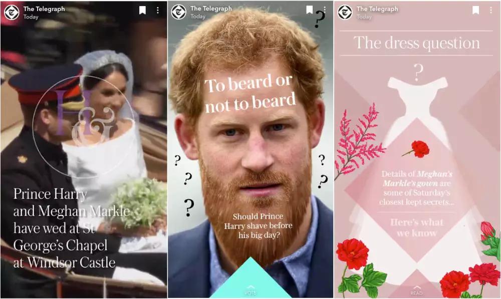 Grant举了一个成功案例,在英国皇室婚礼当天,《每日电讯报》推送了20条Snap故事,从新郎走出到婚礼结束,事无巨细地全方位展现这对新人的婚礼,甚至还有记者进行专业分析。最终数据显示,年轻人们非常喜欢这类视频。