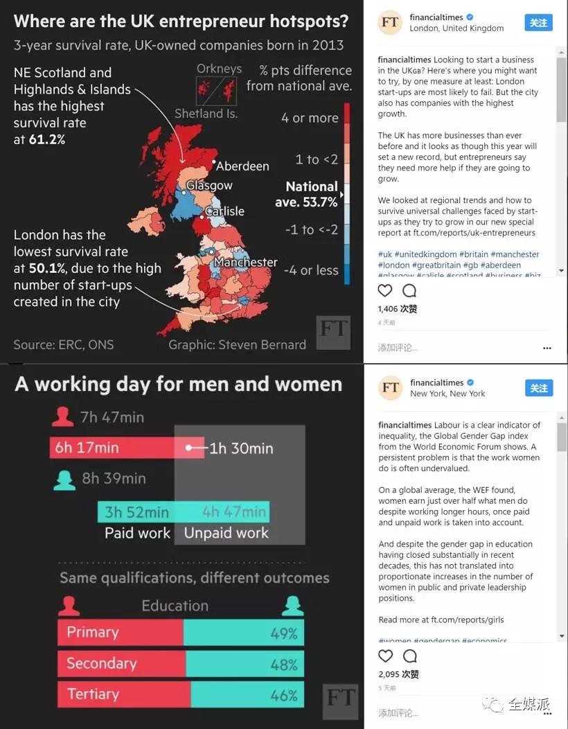 《金融时报》为两条新闻制作的数据图表,分获1406次和2095次赞