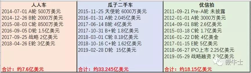 人人车、瓜子、优信融资情况,鞭牛士根据公开信息整理