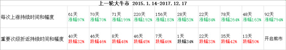Charles Cai表示目前仍无法确定BTC持续上涨的时间,但是通过借鉴历史走势可以寻找到一些蛛丝马迹。“我曾经对2015年开启的那轮大牛市行情做过一个统计(下图所示),当时市场几乎每隔一段时间就会出现一次超过30%的回调行情,上涨持续时间在22天-220天之间,均值为84.6天,约等于三个月,期间八成的涨幅都在200%以下。而如今,比特币价格自今年2月初低点以来,上涨行情已经持续了超过4个月,而且涨幅已经逼近200%,期间最大的调整幅度未超过20%。”