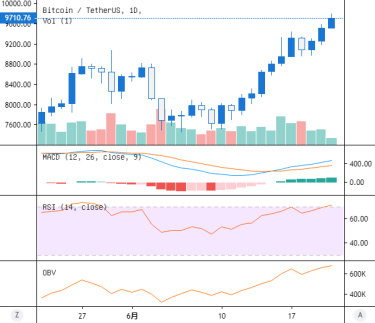 从6月19日起,BTC的日K线图三连阳,收市价依次上升,形成“前进白色三兵形态”,士兵作为一种威慑,往往具有衡量国家力量,暗示战争走向的作用,蜡烛图中的三兵形态亦然,这意味着市场将继续走强。从MACD指标上看,目前MACD线位于信号线上方,且并未表现出减弱的势头,显示市场尚未见顶。从RSI指标看,目前RSI在70左右,尚未达到80,表示还没有达到牛市中的超买水平(注:一般而言RSI达到70即显示超买状态,但在熊牛市中会出现漂移现象,因此20和80成为熊牛市中两个关键临界点)。从OBV上看,目前BTC的价格继续呈上升趋势,而OBV也呈上升趋势,未发生背离现象,表明在未来将继续,不会发生反转。综上,在中短期内BTC的价格将继续呈上升趋势,BTC价格突破10000美元指日可待。