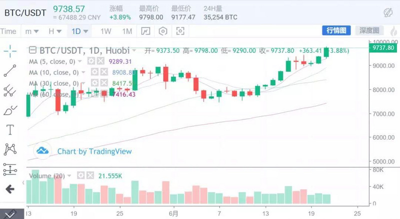 6月21日上午10时左右,据火币全球行情显示,BTC快速上涨,突破9700USDT,逐逼10000美元心里关卡,时隔一年,比特币有望重返五位数。BTC现报价 9716.69美元 ,日内涨幅3.66%。